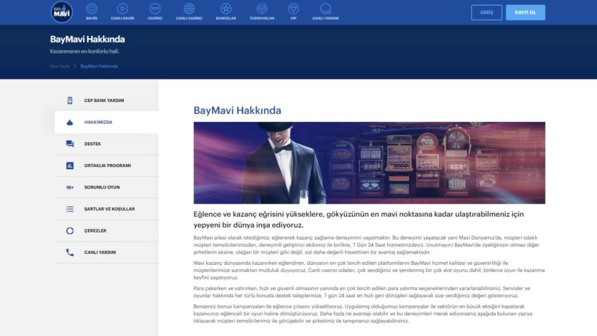 Baymavi bahis sitesi, tüm kullanıcılara, bahis, canlı bahis, casino, canlı casino, turnuvalar oyun seçeneklerini gösteriyor. Casino slot ve canlı casino oyunlarını en iyi oyun sağlayıcılar ile kaliteli caisnolarda oynatıyor. Canlı oyun masası seçimi yapacak olanlar oyun sağlayıcı firma seçimi yaparak işlemlerini yapabiliyor.
