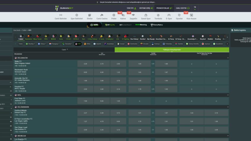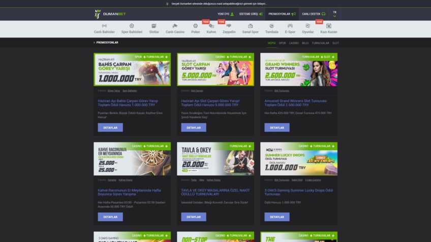 Temel hizmet alanı spor ve canlı bahis olan Dumanbet, binlerce bahissevere hizmet veriyor. Dumanbet sitesi spor programında futbol, basketbol ve voleybol gibi branşların yanında; hentbol, tenis, rugby, beyzbol, golf ve kriket gibi alternatif branşları dahi bulabilirsiniz. Özellikle futbol branşında kapsamı oldukça geniş tutan Dumanbet, amatör liglere ait müsabakaları bile programa taşıyor. Bu sayede günlük olarak sitede binlerce müsabaka bulabiliyorsunuz. Spor ve canlı bahis programındaki tüm maçları, garantili yüksek oran avantajı ile sunan Dumanbet; kısa sürede önemli kazançlar elde etmenizi sağlıyor. Ayrıca tek bir maç için sizlere yüzlerce farklı bahis seçeneği açılacaktır.