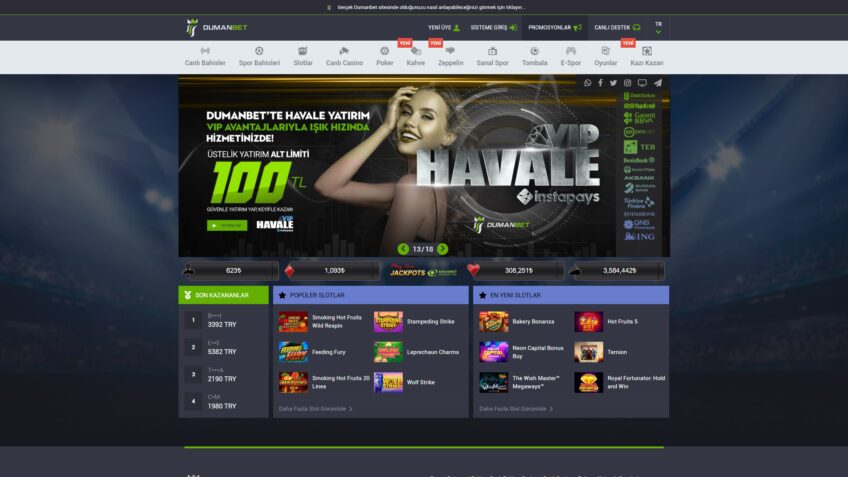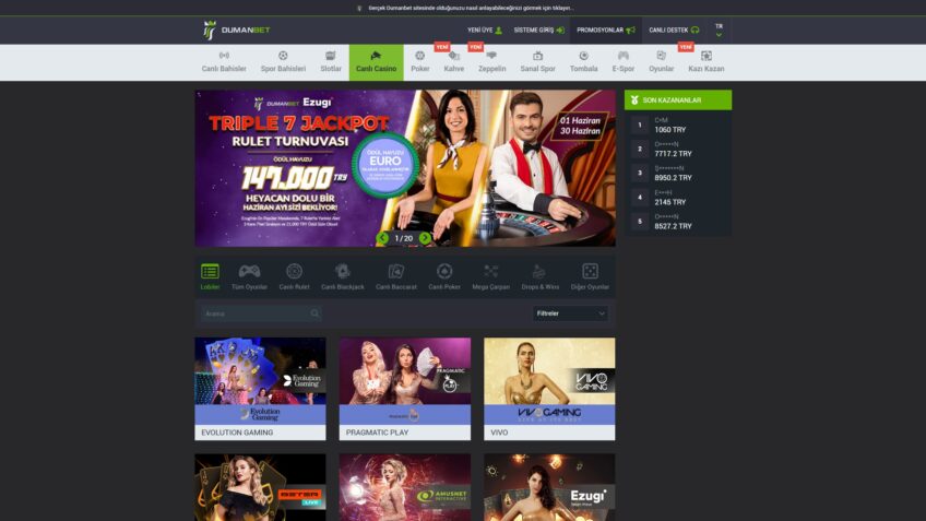 Casino oyunları sevenler için de eşsiz bir deneyim sunan Dumanbet’te, slot oyunlarından blackjack’e, ruletten bakaraya kadar birçok seçenek bulunuyor. Canlı casino bölümünde gerçek krupiyelerle oynayabileceğiniz oyunlar da mevcut.