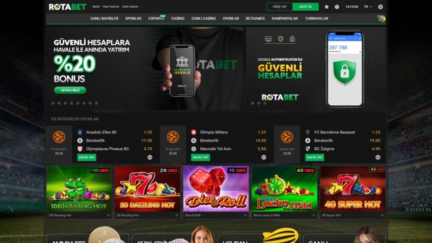 Son derece popüler bir site olan Rotabet sunduğu hizmetlerle, bahis severlere pek çok avantaj sağlamaktadır. Bahis sektöründe ismini duyuran Rotabet ile siz de kazanmaya başlayabilirsiniz. Sitede normal bahis hizmetlerinin yanı sıra canlı bahis hizmeti bulunmaktadır. Rotabet canlı bahis seçenekleriyle peş peşe yaptığınız kuponlarla daha fazla kazanma şansı elde etmeniz mümkündür. Bu alanda futbol dışında basketbol, voleybol, buz hokeyi, hentbol gibi pek çok farklı spor dalına ait karşılaşmalar yer alır. Canlı TV bölümünden birçok karşılaşmayı HD ve kesintisiz bir şekilde izleyebilirsiniz. Rotabet’te bulunan Canlı TV bölümü normalde ücretli olarak yayınlanan Premier Lig, UEFA Şampiyonlar Ligi, La Liga, Amatör Lig gibi pek çok karşılaşmayı kullanıcılarına ücretsiz olarak sunar. Aynı zamanda Canlı TV bölümünde yayın internet hızınıza göre otomatik ayarlanır. Bu nedenle kesinti ve takılma gibi problemler meydana gelmez. Aynı zamanda Rotabet üzerinde son derece geniş seçenekli casino oyunları yer alır. Casino oyunlarında kullanıcılara birbirinden güzel krupiyeler eşlik etmektedir. Bunun yanı sıra Rotabet, sunduğu pek çok promosyon ve bonusla da kullanıcılarına avantaj sağlamaktadır.